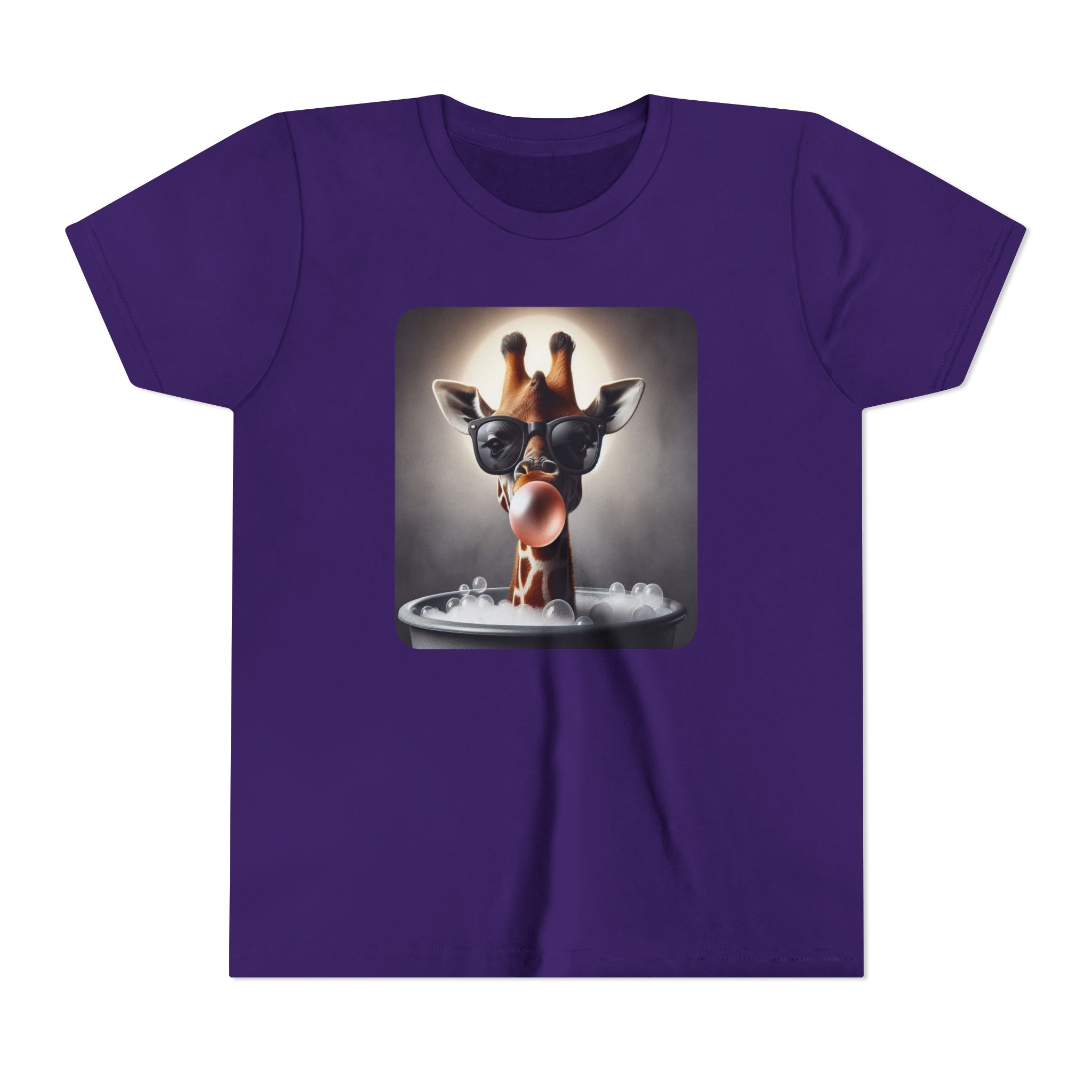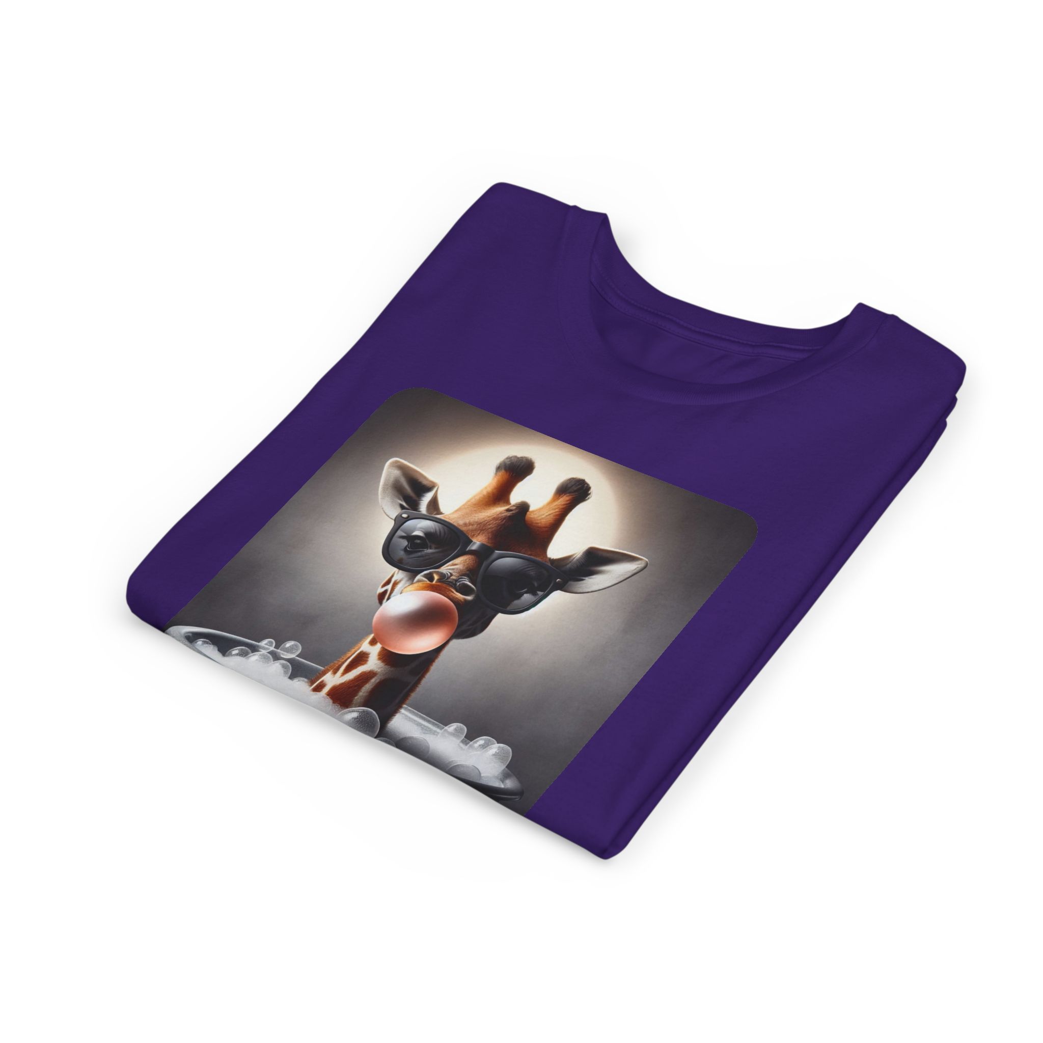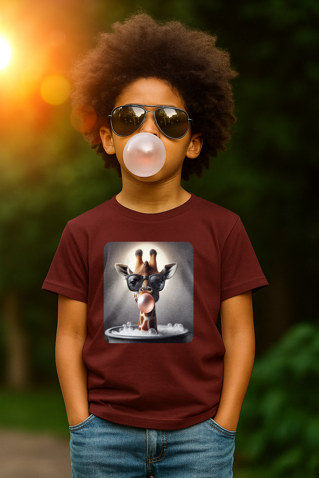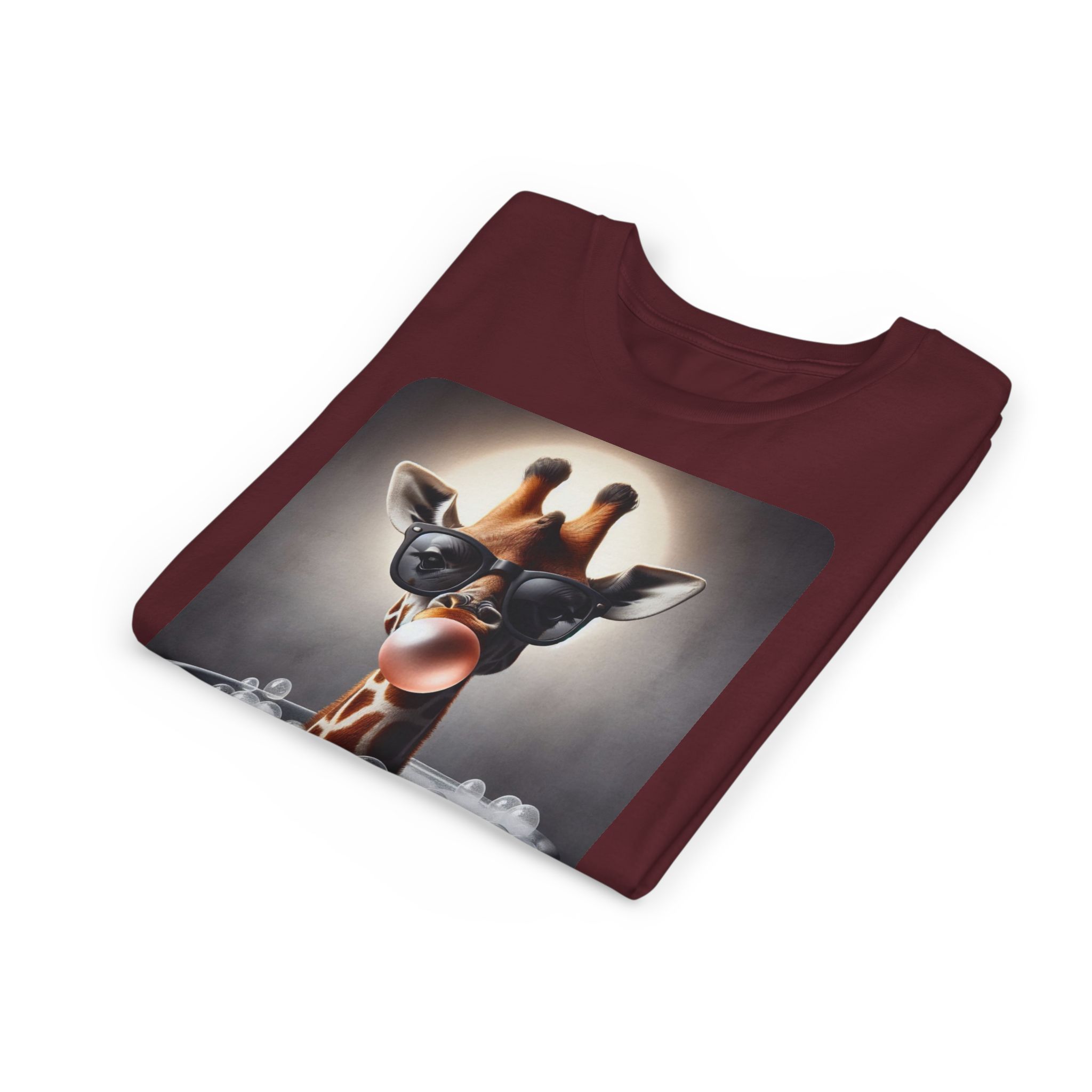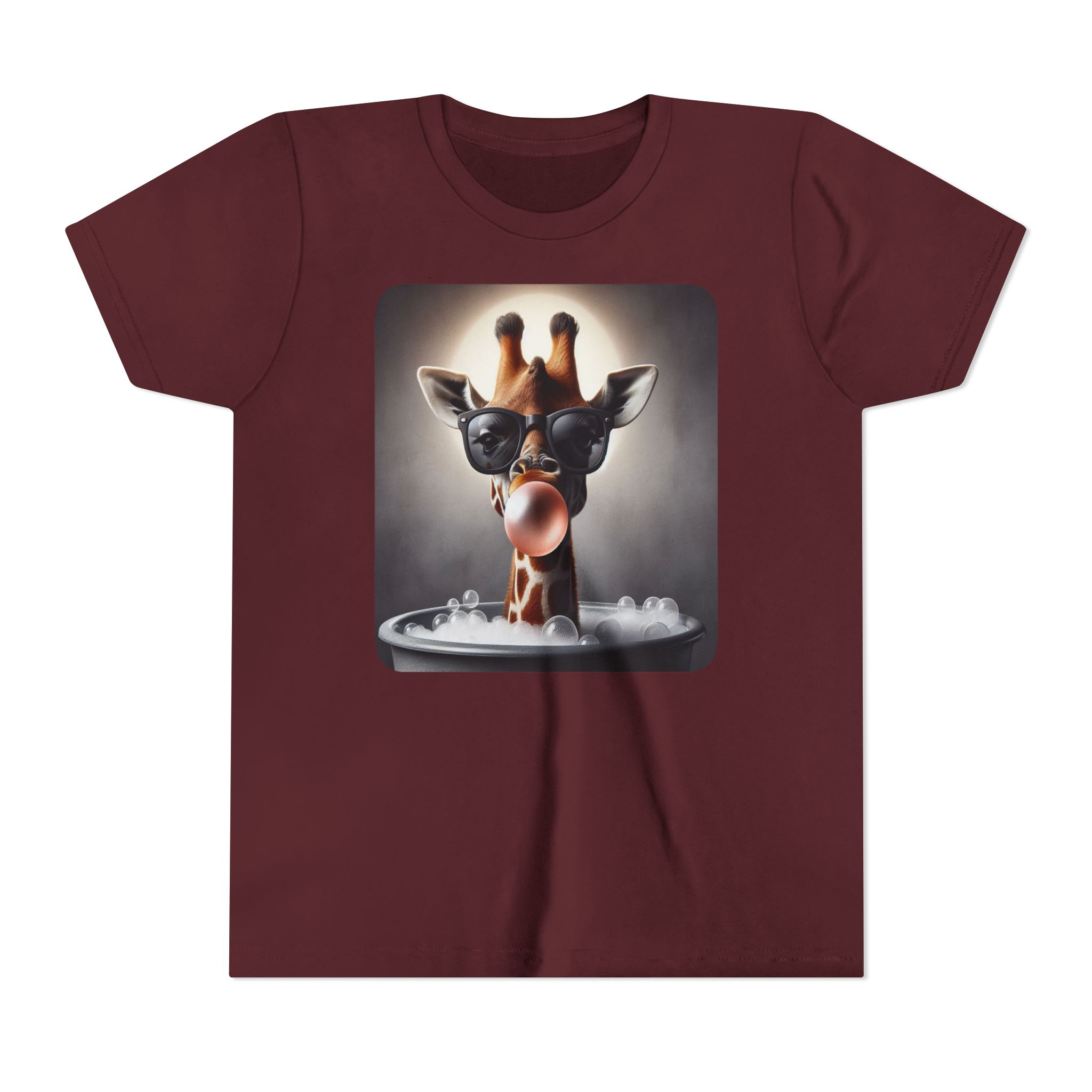 This burgundy kids tee features a bold graphic of a sunglass-wearing giraffe blowing a bubble bathgum bubble from a bubbly tub. It’s quirky, confident, and just the right amount of mischievous. Designed for kids who already know they’ve got style, even if they’re still working on tying their shoes.