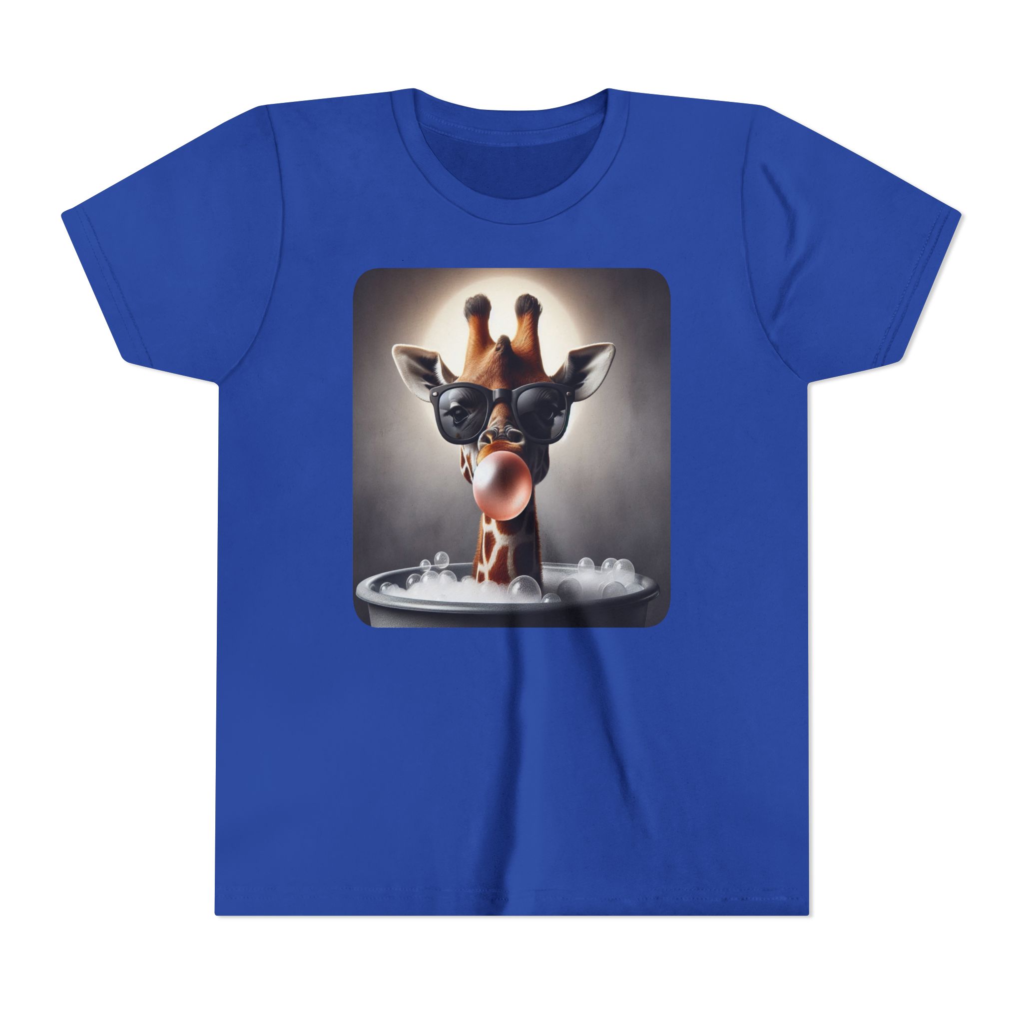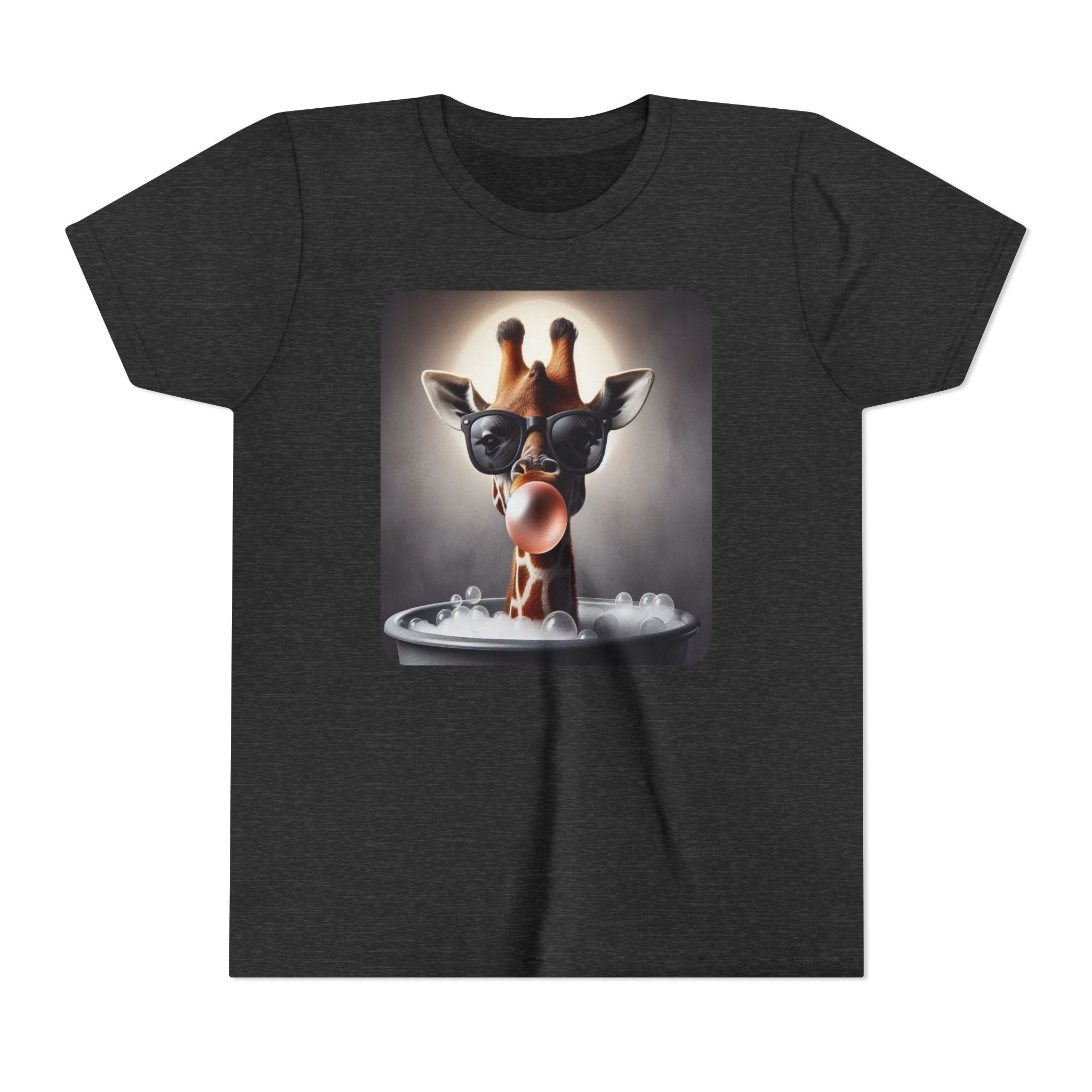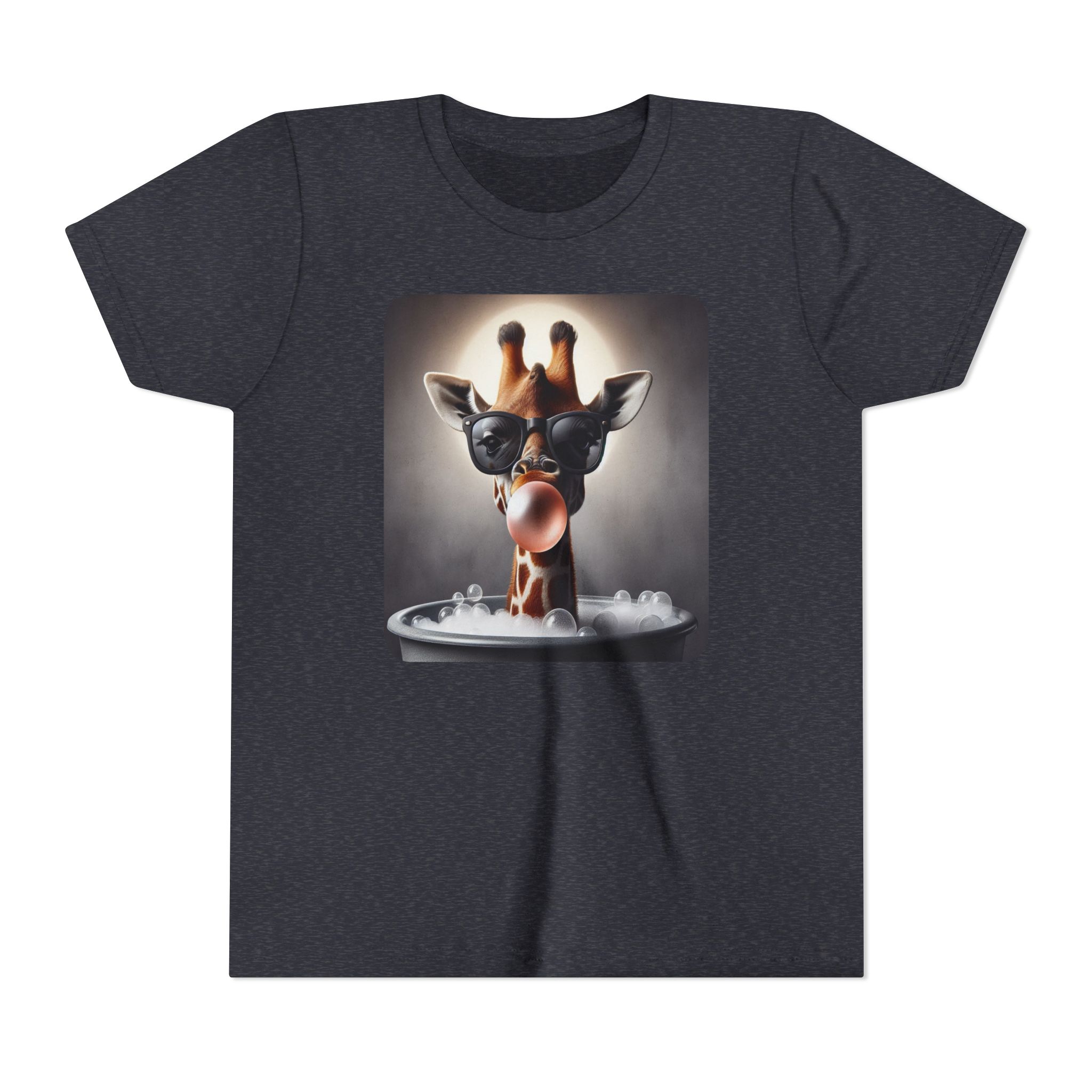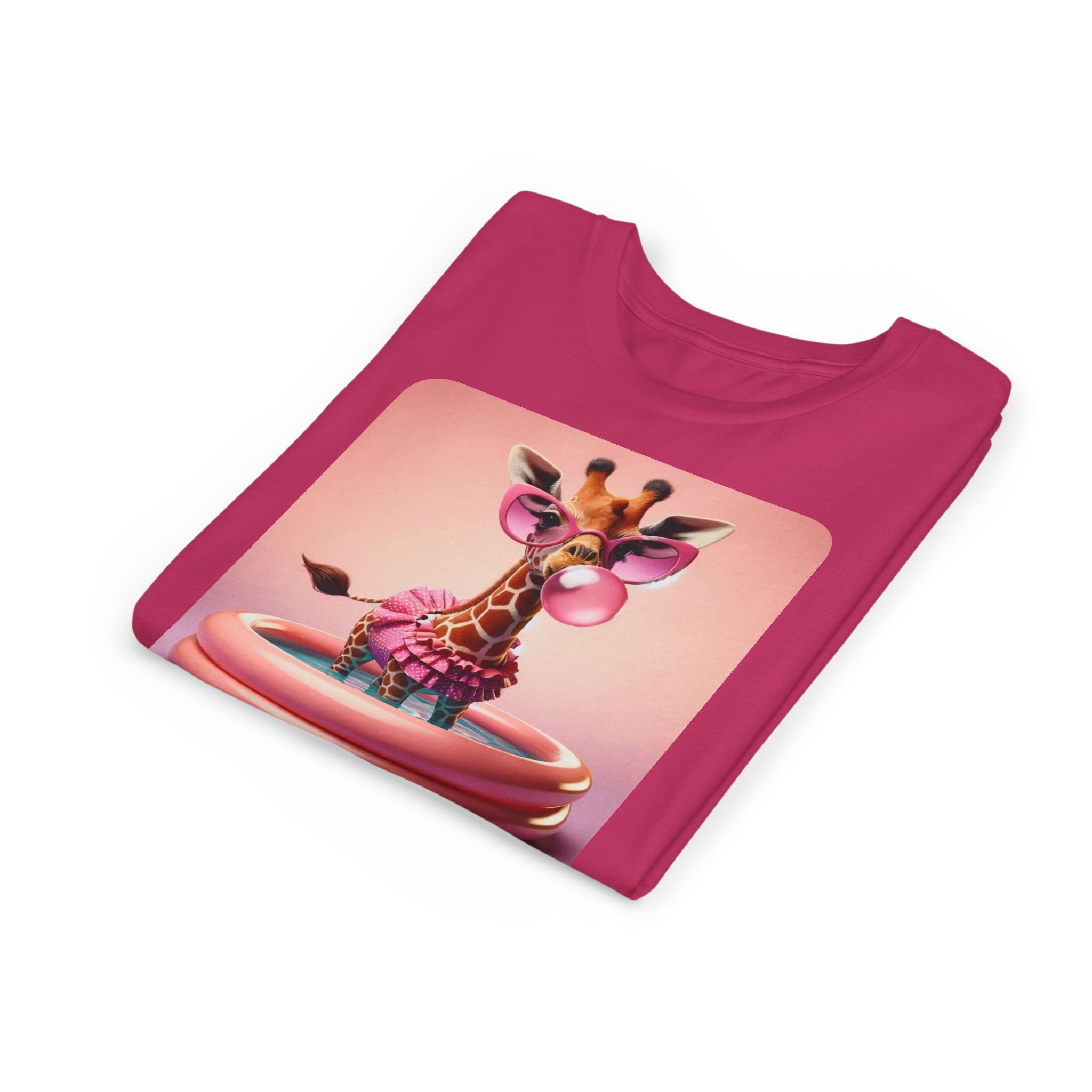 This burgundy kids tee features a bold graphic of a sunglass-wearing giraffe blowing a bubble bathgum bubble from a bubbly tub. It’s quirky, confident, and just the right amount of mischievous. Designed for kids who already know they’ve got style, even if they’re still working on tying their shoes.