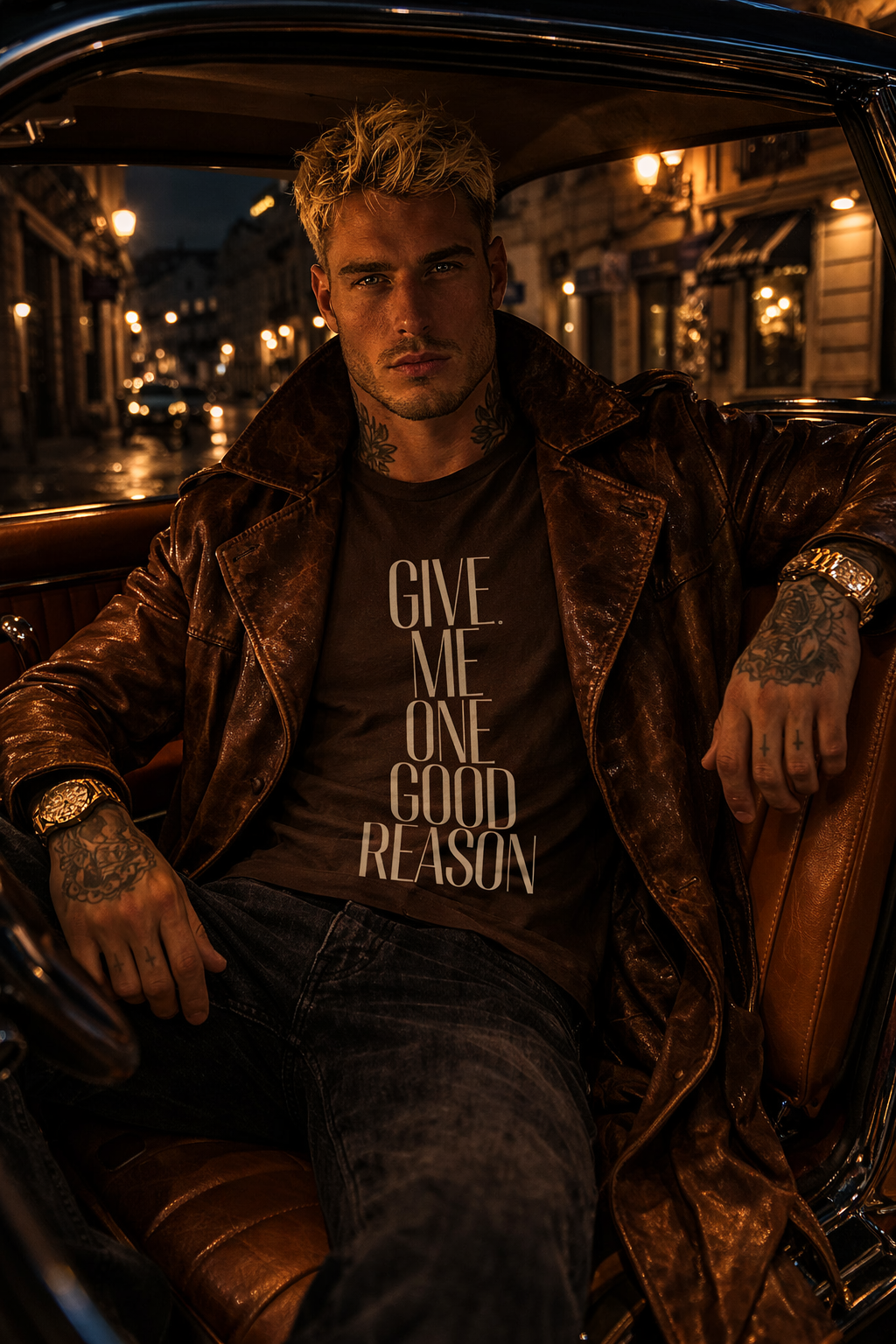 The Give Me One Good Reason Tee is built around a phrase that feels both mysterious and confident. The design plays on curiosity and attitude, delivering a message that invites interpretation while keeping the tone cool and understated. It’s the kind of line that sparks conversation without trying too hard, making it perfect for anyone who appreciates quiet confidence and sharp wit.