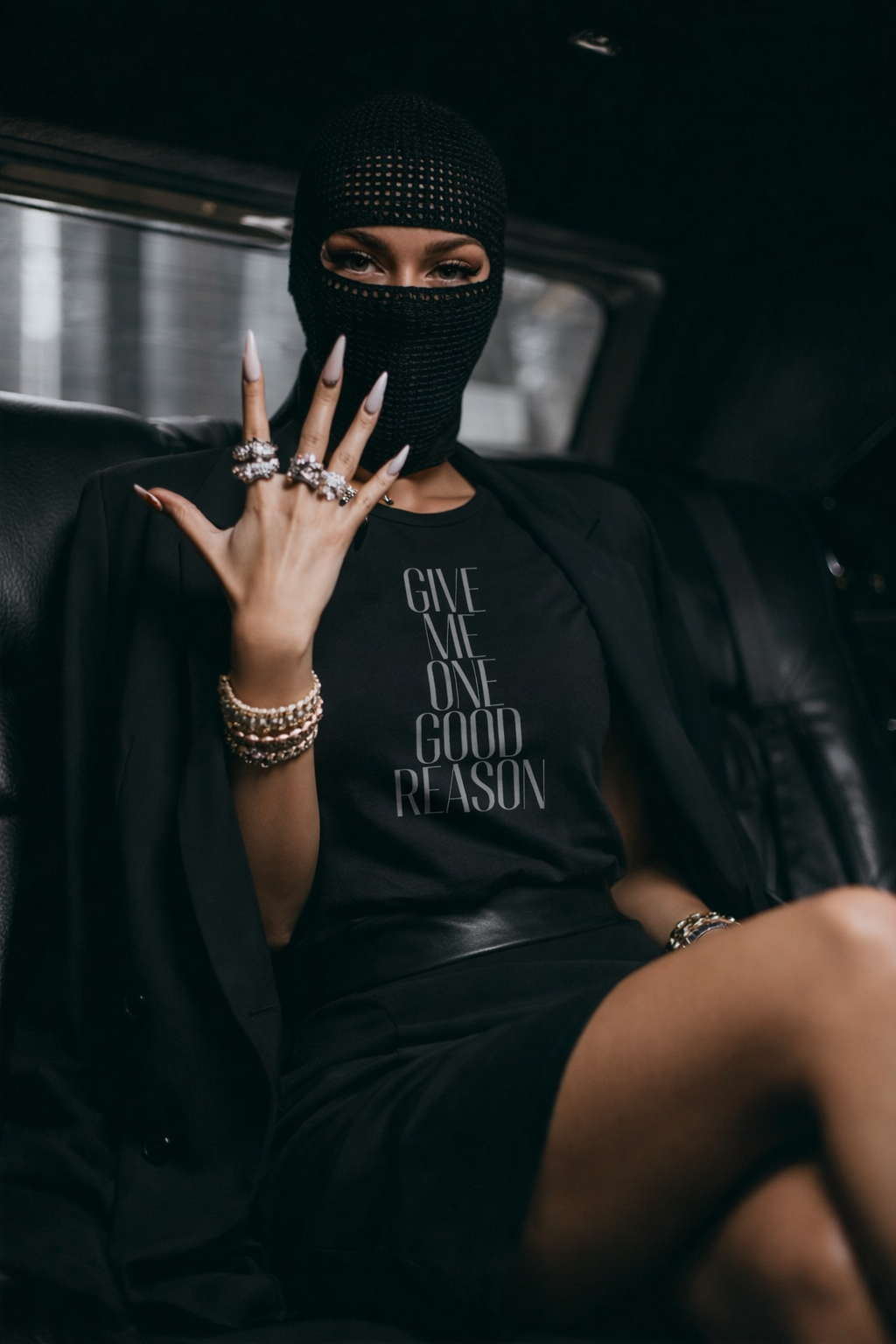 The Give Me One Good Reason Tee is a sleek, unapologetic statement piece built around powerful simplicity. The vertical typography commands attention without shouting, stacking each word into a clean, architectural design that feels modern, sharp, and quietly rebellious.