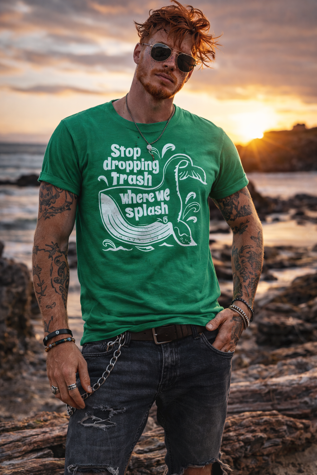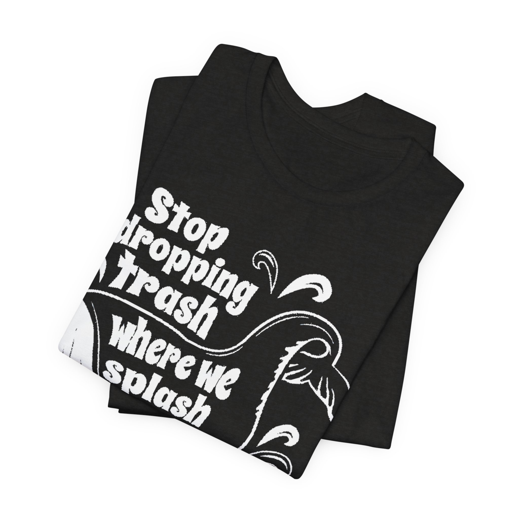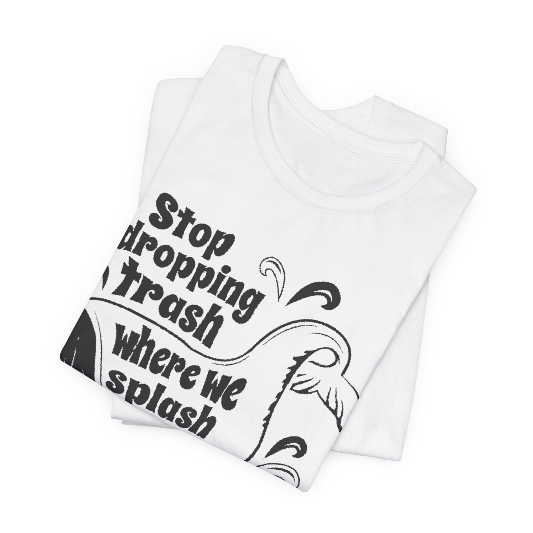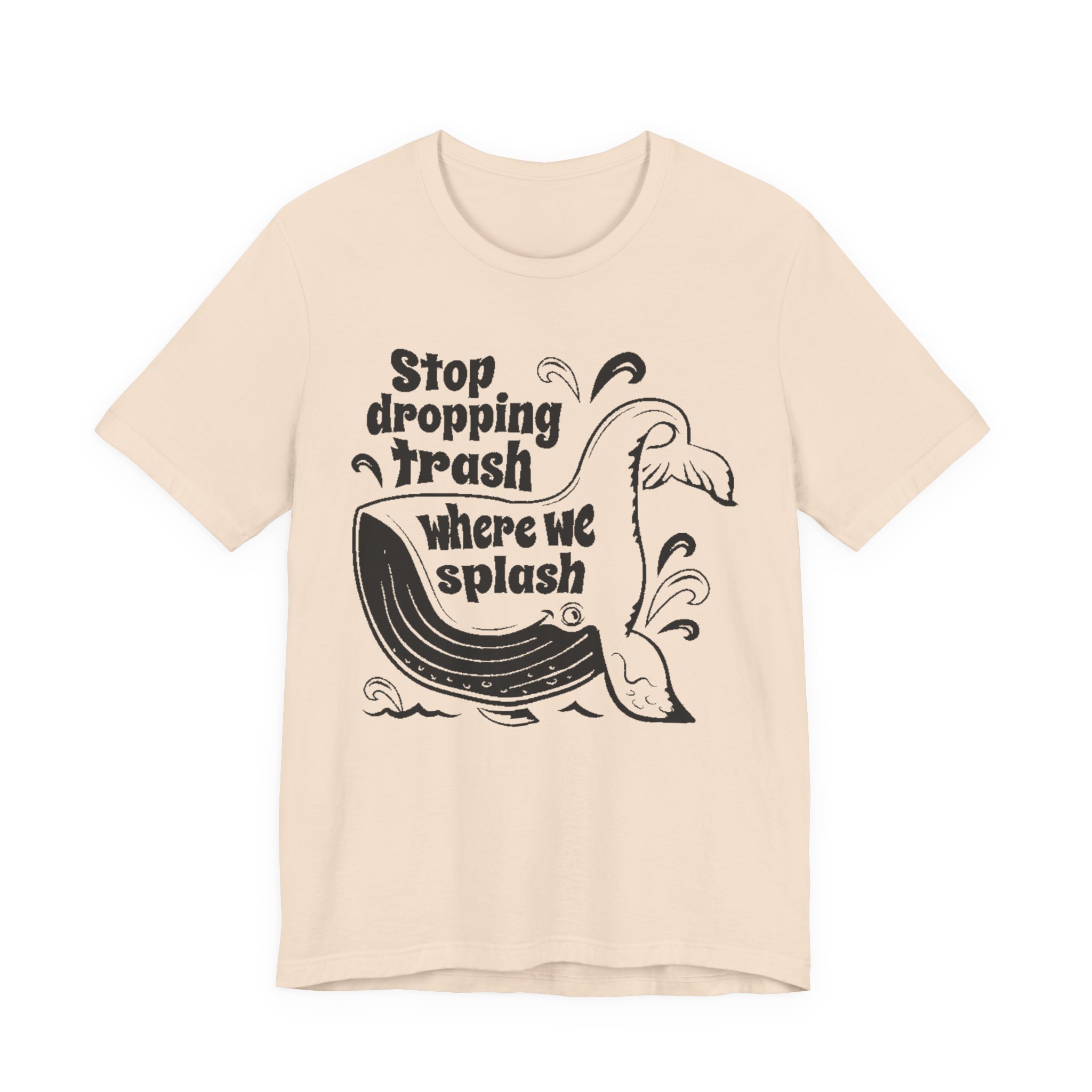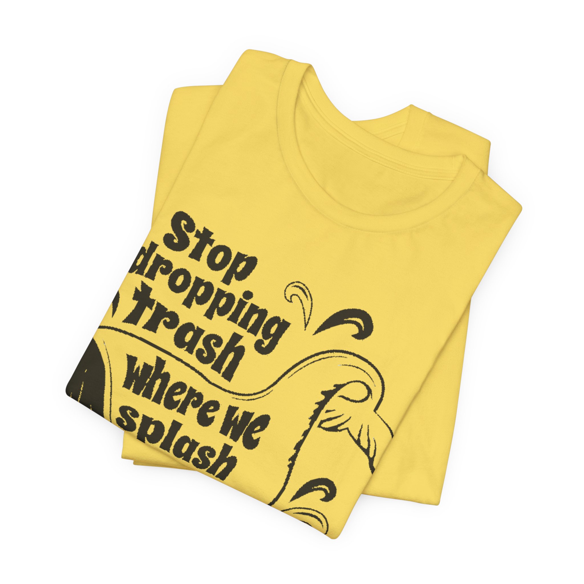 Make waves without saying a word. This bold green graphic tee features the original “Stop dropping Trash where we splash” artwork in crisp white, wrapped around a playful whale illustration. Clean print. No added effects. No distressing. Exactly as designed.