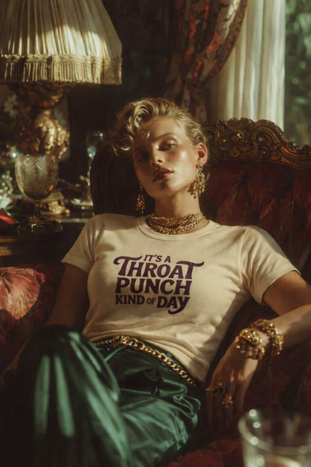 The It’s a Throat Punch Kind of Day Tee captures the humor of those moments when patience is running on fumes and sarcasm is the only survival strategy. Designed with a playful edge and unapologetic personality, this piece turns everyday frustration into wearable comedy. It’s bold, relatable, and just the right amount of savage.